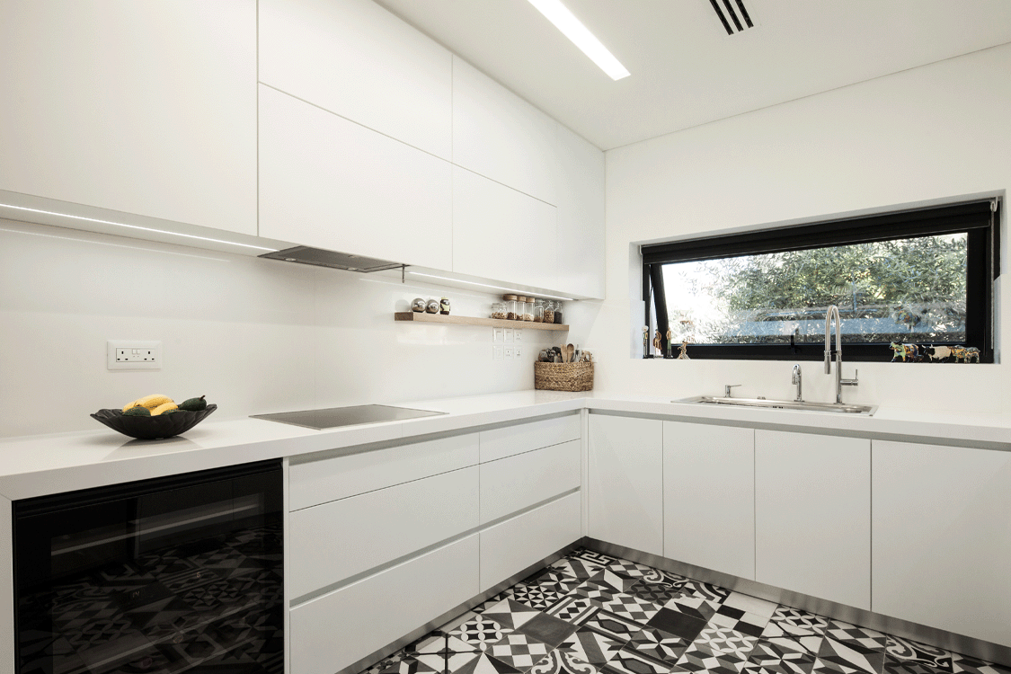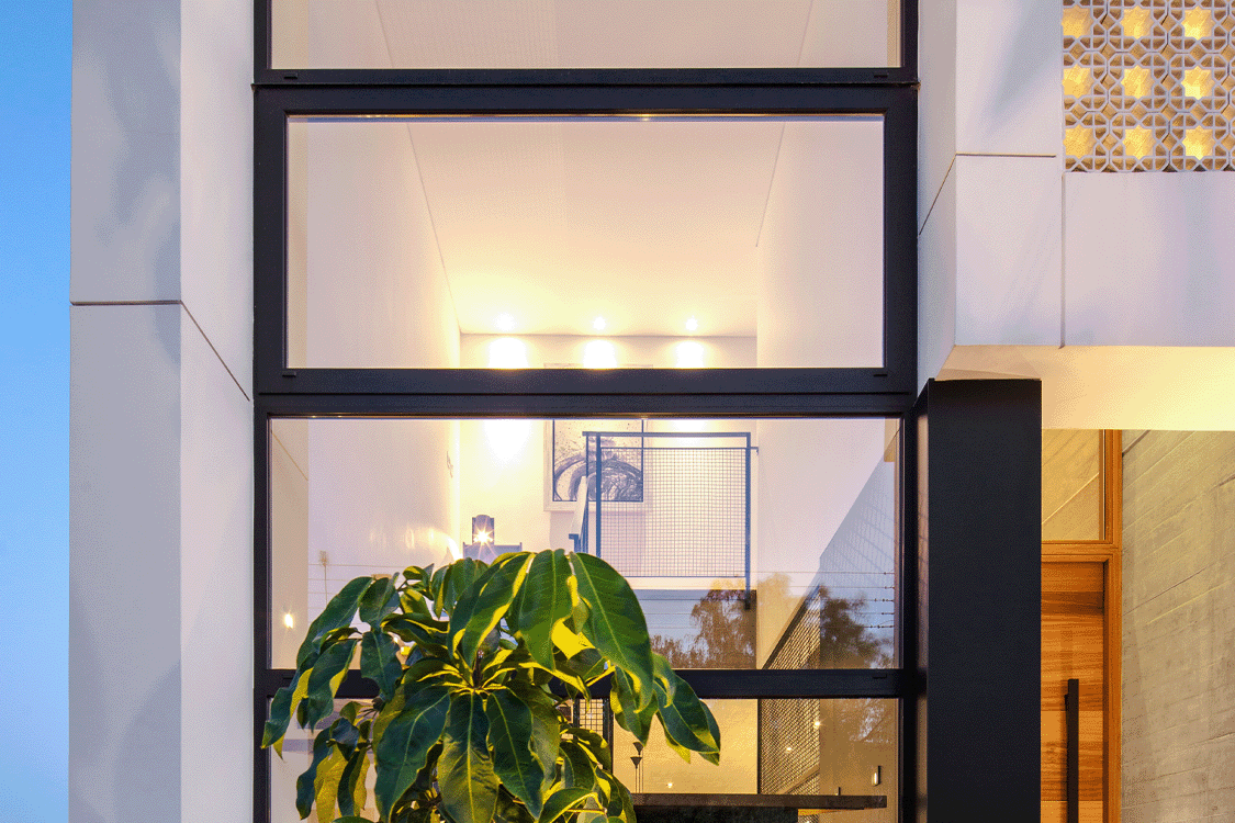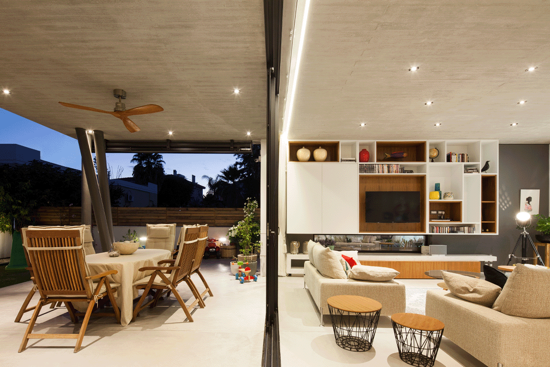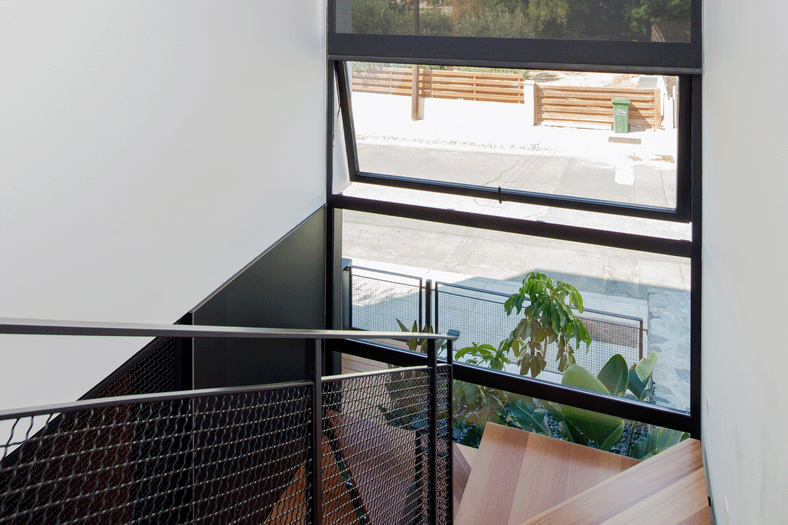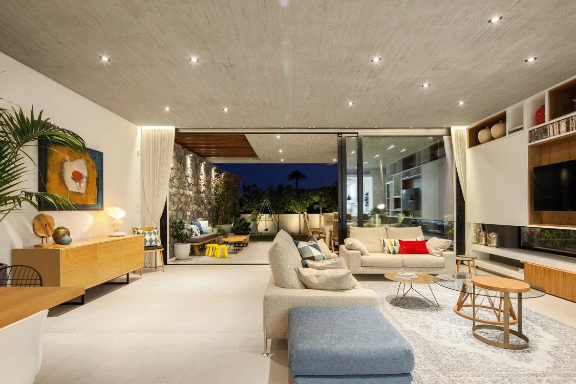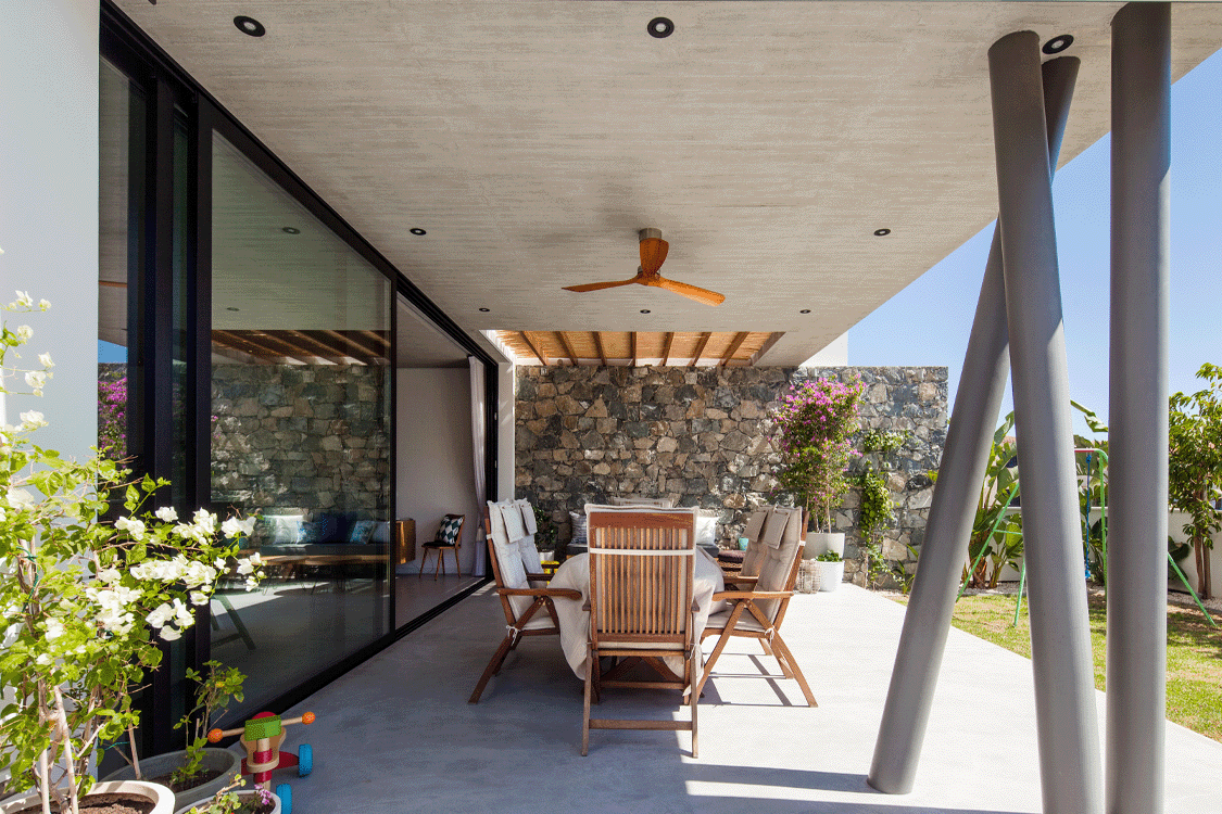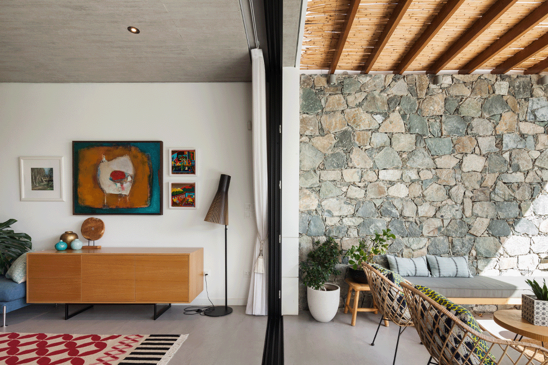Η ιδιαίτερη αυτή κατοικία συνδυάζει υλικά όπως πέτρα και ξύλο, προσδίδοντας στο χώρο μια γήινη αισθητική. Το εσωτερικό ενοποιείται με το εξωτερικό με μια κεντρική συρόμενη πόρτα δίνοντας την ευκαιρία στους ένοικους να απολαμβάνουν ανεπηρέαστα τους εξωτερικούς κήπους του σπιτιού.
