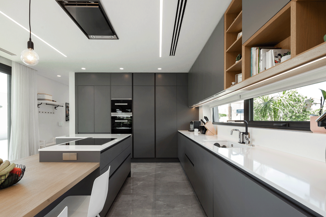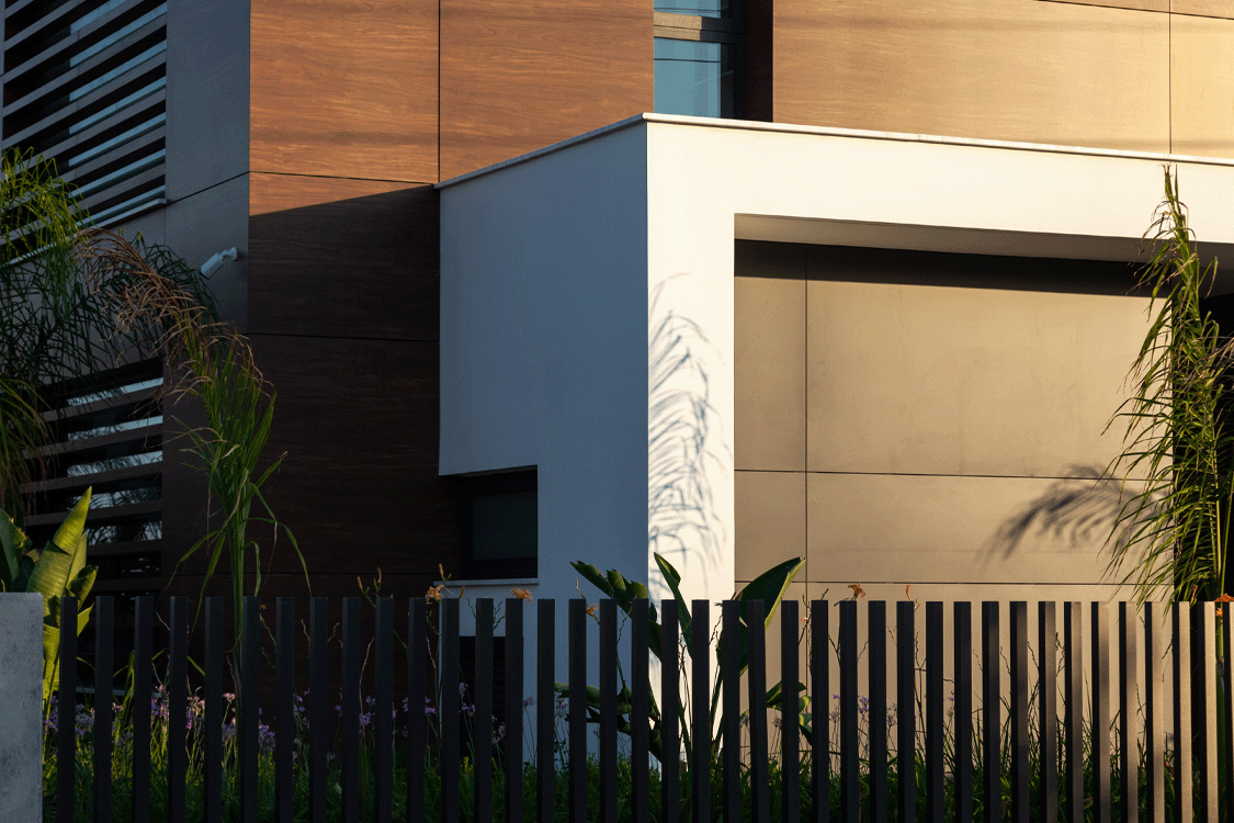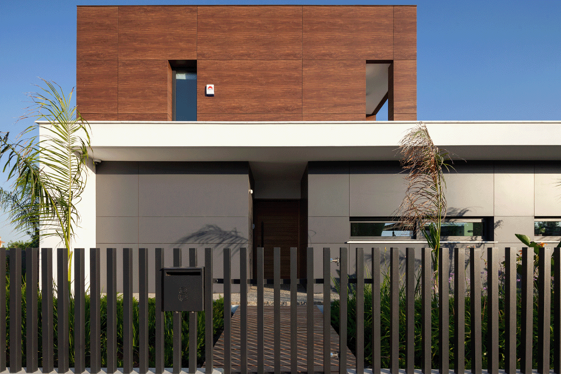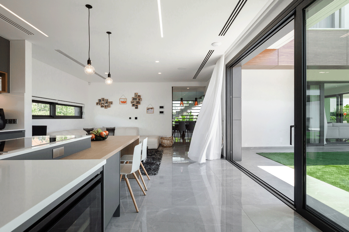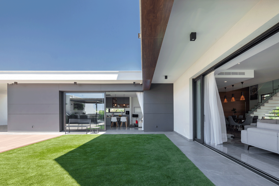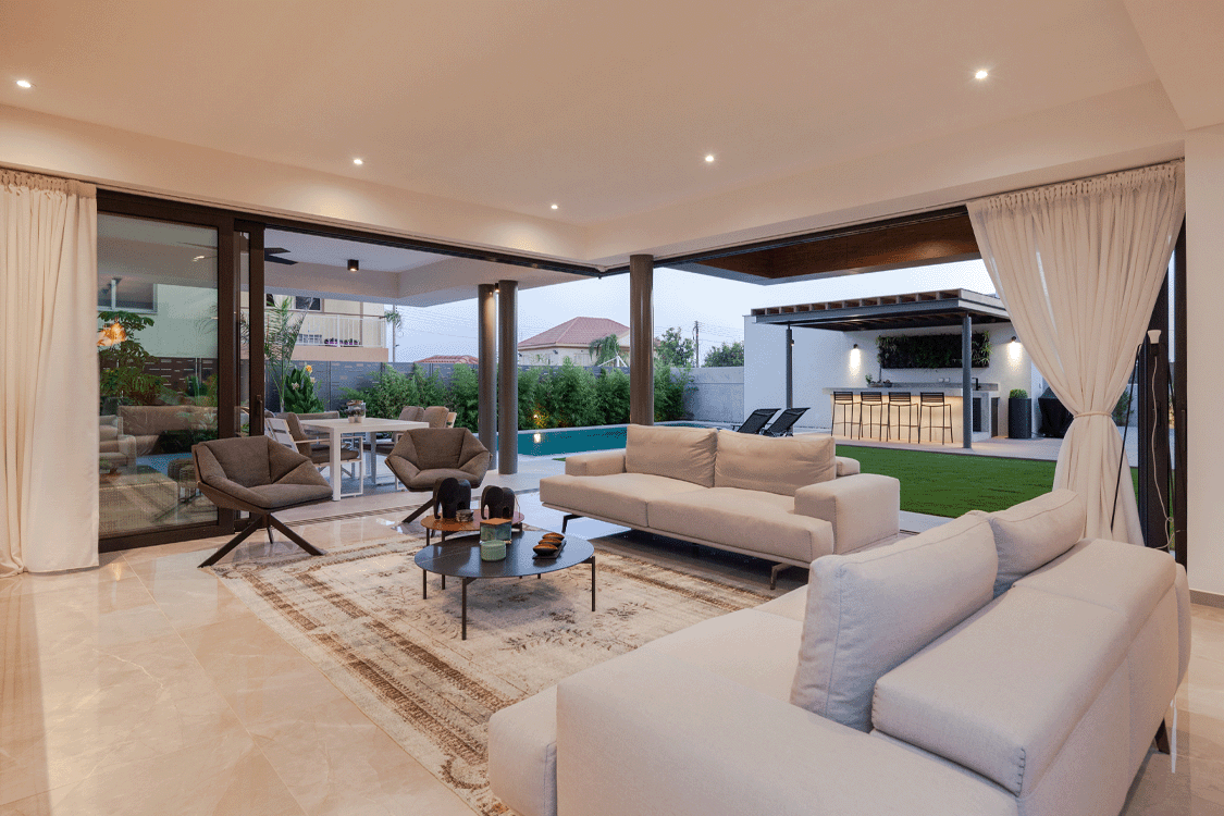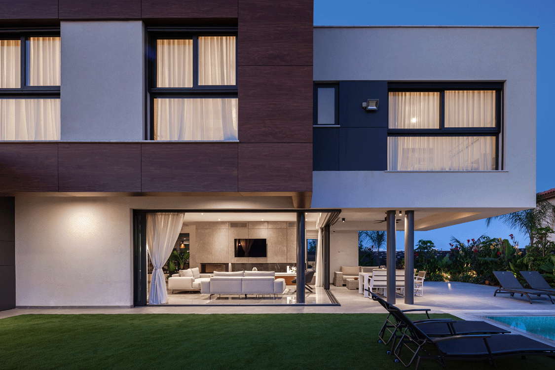 Η κεντρική ιδέα του σχεδιασμού της μοντέρνας αυτής ιδιωτικής κατοικίας, στηρίζεται στην ενοποίηση του μέσα με το έξω. Τα μεγάλα συρόμενα ανοίγματα, καλύπτουν ολόκληρη την γωνιακή πλευρά του σαλονιού, δημιουργώντας την αίσθηση ότι βρίσκεστε στο εξωτερικό του σπιτιού.