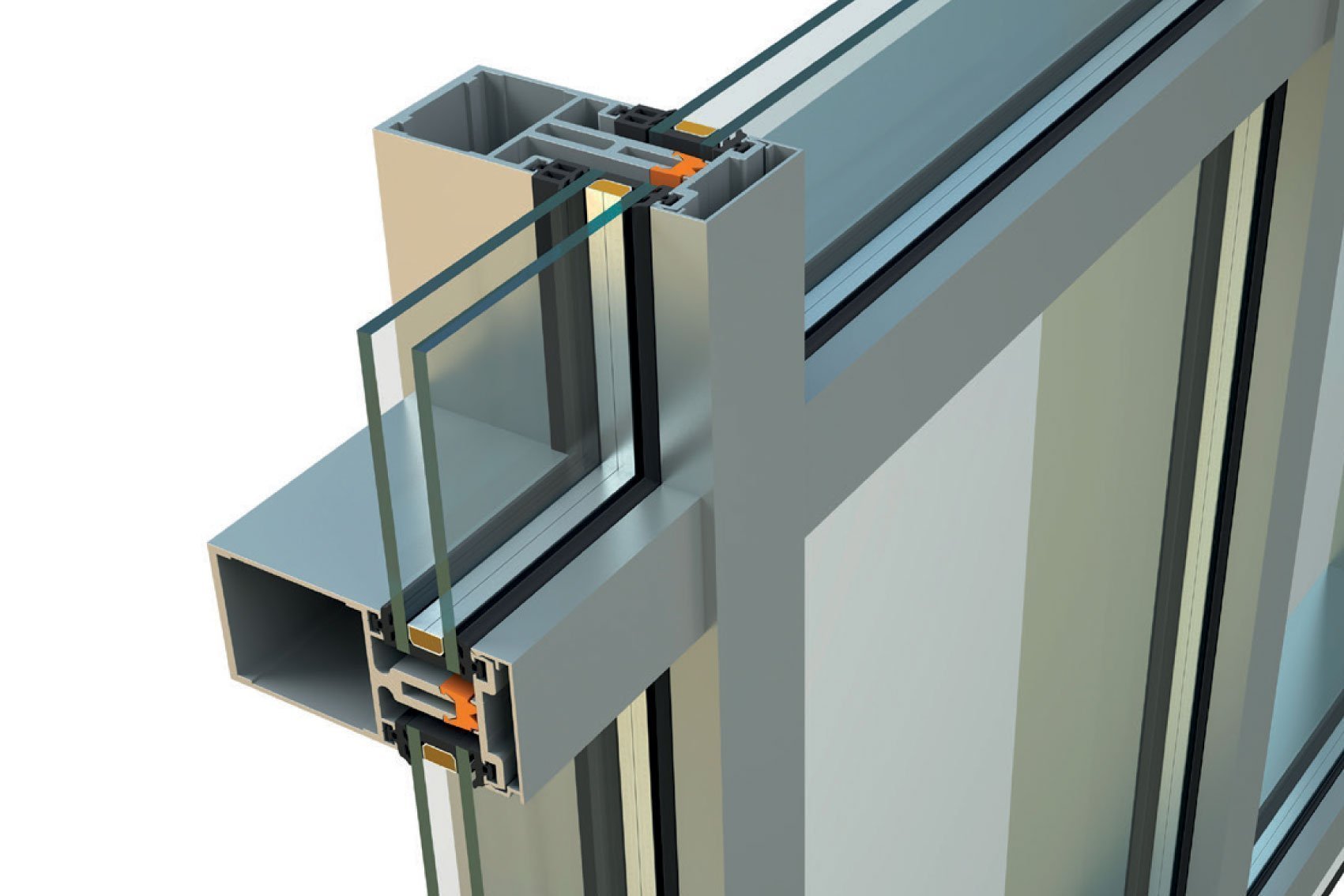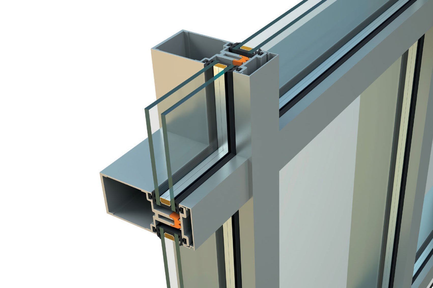 • The system seals with EPDM watertight gaskets, rubber insulator profiles between the mullions/transoms and the pressure plates supporting the glazing units, achieving perfect air and water tightness, while preventing heat transfer from the outside in and vice versa.